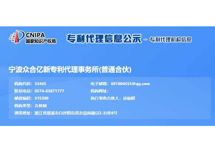 浙江億新知識產權服務有限公司前身為慈溪眾合知識產權代理事務所,創始于2004年,為了服務更多的創新企業,實現“服務億萬創新企業”的理念,后更名為浙江億新知識產權,旗下公司包括:寧波眾合億新專利代理事務所(機構代碼33405)、中范(北京)認證有限公司。其中寧波眾合億新專利代理事務所是慈溪市科技服務聯盟理事單位,前灣區知識產權工作站。公司位于浙江省慈溪市文化商務區友誼商廈,并在北京、青島設有辦事處。